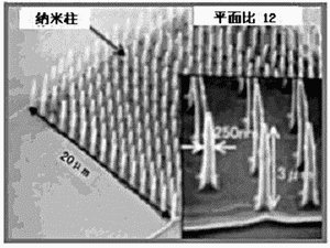 在高寬比納米印刷技術(shù)中,可以簡(jiǎn)單地形成直徑為25nm、高3μm(平面比為12)的納米級(jí)柱狀結(jié)構(gòu)集合體(見圖2)。該結(jié)構(gòu)在以往的精密塑料成型中是很難形成的,但使用了高寬比納米印刷技術(shù),用一次壓延就能成型。