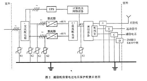 機房內(nèi)專設(shè)交流配電箱。該處配電箱供電采用三相四線制供電,嚴(yán)格實現(xiàn)機房內(nèi)各設(shè)備接地接零分開;安裝電源和信號避雷器,其避雷器接地采用合防雷器,S2為DEHNguard T385型電源2級防雷器,S3為DEHNrail 48FML型電源3級防雷器(直流48 V),A為UGK/N(2.5 G)天饋線防雷器,B為YG20-A音頻隔離變壓器,C為ZH型中和變壓器,D為同軸防雷器。
