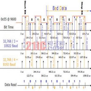 通過混合兩個時鐘除數(shù)解決錯誤,總體積累的錯誤消失,數(shù)據(jù)接收正確。這種方法對于9,600波特或以下的UART通信很有效。對于高速通信,幾個µC監(jiān)視UARTRx行的邊緣躍遷并觸發(fā)ISR啟動內部高速振蕩器,驅動CPU并處理中斷。這使µCUART能夠接收高速數(shù)據(jù),而不必在UART空閑期間保持一個啟動的高速時鐘。如果使用外部振蕩器或內部振蕩器頻率太低,則由于啟動高速振蕩器需要一定的時間,第一次傳輸將失效。為克服這一限制和效率損失,設計人員應該考慮使用能夠喚醒并及時從32kHz或停機模式激活的處理器,從正在傳輸?shù)腢ART恢復首次傳輸?shù)臄?shù)據(jù)。例如,系統(tǒng)時鐘需要在25µs內啟動,才能拾取起始位的中間點,從而正確接收19,200位的傳輸。