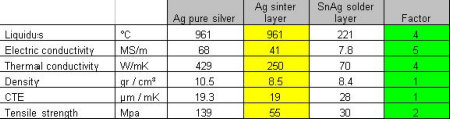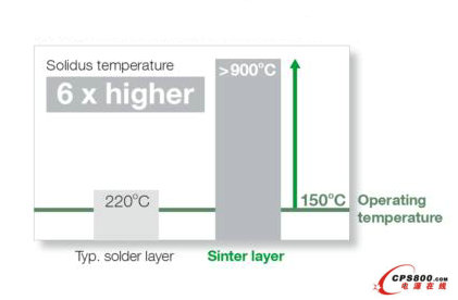如果有人要考慮燒結層的厚度,燒結層的厚度比標準焊接層薄4.5倍,導熱系數大4倍。這使得燒結連接具有良好的熱性能。燒結層也表現出遠高于焊接層的循環(huán)能力。這就得到一個事實,即燒結連接中所用銀的熔點比今天普遍使用的無鉛焊料要高出4倍(見表1)。燒結技術高溫穩(wěn)定性表明連接層沒有老化。