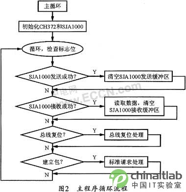 單片機AT89C52在系統(tǒng)中主要起到一個橋梁和協調控制的作用。主機通過CH372把數據發(fā)送到單片機,單片機再把數據通過SJA1000發(fā)送到CAN總線,從而實現整個系統(tǒng)的通信。此外,單片機還需要對CH372和SJA1000進行初始化,并通過地址/數據以復用的方式訪問CH372和SJA1000。由于在訪問其中一個芯片時,如果另一個芯片還保持有輸出,那么單片機就不能讀到正確的數據,因此,單片機要通過片選控制信號分配有效地址。單片機主要通過主循環(huán)來監(jiān)控系統(tǒng)的通信,其主循環(huán)流程圖見圖2所示。[page]