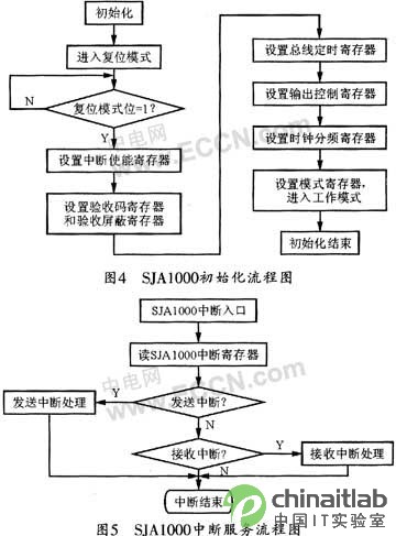 在CAN總線端,單片機控制著傳輸流程。SJA1000的初始化由單片機完成,其初始化流程圖見圖4所示,在正常工作模式下,單片機可控制SJA1000的收發(fā)等操作,以完成和CAN總線的通信。當主機端傳來數據時,單片機將數據轉發(fā)到SJA1000的發(fā)送緩沖區(qū),并由SJA1000根據CAN協議自動封裝后發(fā)送到CAN總線上;當SJA1000接收到來自CAN總線上的一個有效的報文后,系統(tǒng)將在INT引腳上產生一個硬件中斷信號(低有效),當單片機收到中斷信號后,即進人中斷服務程序,以完成數據的接收和處理,其中斷服務流程見圖5所示。