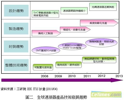 金融風(fēng)暴過后,連接器產(chǎn)品技術(shù)革新仍持續(xù)推進,以下將由設(shè)計、制造、封裝/組裝三大構(gòu)面探討連接器技術(shù)層面的發(fā)展趨勢(見圖二):