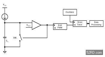 比較器的輸出用來(lái)作為脈沖寬度調(diào)變(PWM)的時(shí)脈,并進(jìn)而成為使用高速內(nèi)部時(shí)脈計(jì)時(shí)器的極閘。當(dāng)PWM產(chǎn)生插斷訊號(hào)時(shí),計(jì)時(shí)器上的值就可以被讀取并且儲(chǔ)存該輸出值。