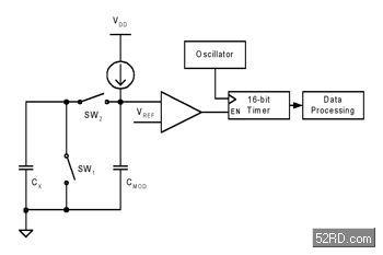 感測(cè)電容器CX與電流源都連接至一個(gè)類比多工匯流排上,其中電流源決定了感測(cè)電容器中充電的速率。而該電容器兩端電位差會(huì)隨著充電電荷累積到匯流排而產(chǎn)生線性增長(zhǎng),其關(guān)系式為q=CV。