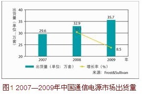 2009年被稱作中國3G的元年,3G網(wǎng)絡的建設直接帶來達上千億元規(guī)模的投資,配套設備同步增長,通信電源需求旺盛。2009年,中國通信電源市場收入達到37億元人民幣,較2008增長了27.6%,通信電源出貨量達35.7萬套,較2008年增長了 8.5%,如圖1所示。