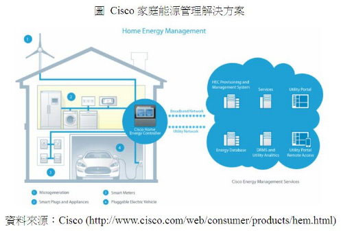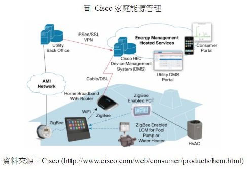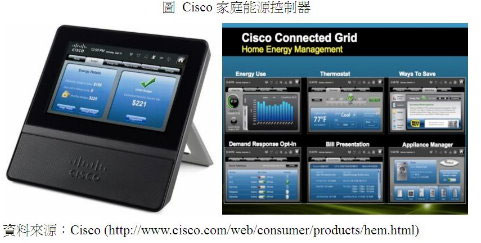 在綠色節(jié)能觀念的日益普及趨勢下,有效管理家中用電的家庭能源管理(Home Energy Management,HEM)成為智慧電網(wǎng)公共建設(shè)外,另一項(xiàng)具備高度發(fā)展?jié)摿Φ氖袌鲱I(lǐng)域。面對民眾對節(jié)能管理的需求,現(xiàn)階段陸續(xù)已有許多國際大廠投入相關(guān)應(yīng)用與服務(wù)的研發(fā);除了Google推出PowerMeter的用電監(jiān)測網(wǎng)路平臺(tái)外(需搭配智慧電表或插座等設(shè)備),Cisco與Intel也陸續(xù)搭上平板電腦熱潮,推出協(xié)助民眾管理家庭用電的HEM裝置。相較于Google PowerMeter,Cisco與Intel所推出產(chǎn)品是以物聯(lián)網(wǎng)(Internet of Things,IoT)概念為基礎(chǔ),透過無線網(wǎng)路模式連結(jié)家中各項(xiàng)電器設(shè)備,進(jìn)行用電資訊的傳遞與監(jiān)控,同時(shí)進(jìn)行遠(yuǎn)端遙控動(dòng)作。 Cisco推出包含家庭能源控制器(Home Energy Controller,HEC)與能源管理服務(wù)平臺(tái)的家庭能源管理解決方案(Home Energy Management Solution,HEMS),作為進(jìn)入家庭節(jié)能市場的第一步。 HEC如同家庭中的監(jiān)控中心,除了可以在螢?zāi)簧霞磿r(shí)顯示家中用電的即時(shí)狀態(tài)資訊外,使用者透過觸控面板的HEC還可以對連線的家電產(chǎn)品進(jìn)行操控,決定是否關(guān)閉或調(diào)整特定家電來節(jié)省電力消耗。