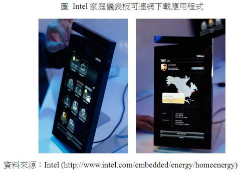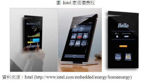 在家庭能源管理的概念下,Intel也推出暫稱為「家庭儀表板(Home Dashboard)」的整合性解決方案,產(chǎn)品設(shè)計(jì)為一個(gè)具備運(yùn)算能力且低耗能的平板電腦。 Intel規(guī)劃此產(chǎn)品成為家庭網(wǎng)路的核心(Heart of the Home Network),使用者可與智慧家電、智慧插座、智慧電表與家中各項(xiàng)感測裝置進(jìn)行連結(jié)與監(jiān)控動(dòng)作,并進(jìn)行家電設(shè)備的安全設(shè)定、溫控設(shè)定、電源