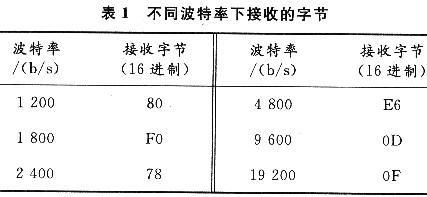 檢測轉(zhuǎn)換裝置的串口波特率,首先可對主機(jī)的接收波特率(以9600b/s為例)進(jìn)行設(shè)定,并在終端發(fā)送一個特定的字符(以回車符為例),這樣,主機(jī)根據(jù)接收到的字符信息就可以確定轉(zhuǎn)換裝置的通信波特率?;剀嚪腁SCII值是0DH,在不同波特率下接收到的值如表1所列。[page]