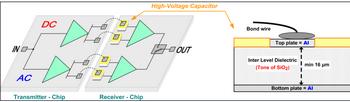 圖2的右側(cè)顯示了一個(gè)高壓電容器的橫截面。從發(fā)送器芯片出來的接合線連接到接收機(jī)端電容器鋁頂板。底板(也為鋁質(zhì))連接到接收機(jī)邏輯。板之間是夾層電介質(zhì),其為16-μm厚的二氧化硅(SiO2)層。