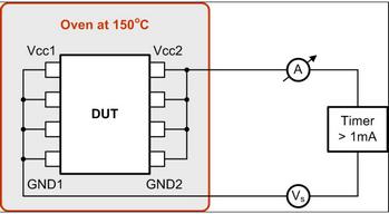 實(shí)際上,周圍溫度維持在150oC時(shí),TDDB由隔離器的施加應(yīng)力電壓決定(請參見圖5)。測試之初便激活一個(gè)計(jì)時(shí)器,其在隔離器電流超出1mA時(shí)停止,表明電介質(zhì)擊穿。記錄每個(gè)測試電壓的故障時(shí)間,并根據(jù)理論E模型曲線進(jìn)行繪圖。