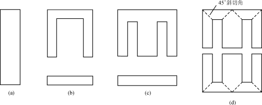 疊片式鐵心是把硅鋼帶材通過剪切或沖壓成鐵心片,然后疊裝成一定結(jié)構(gòu)形式的鐵心。從鐵心片形狀發(fā)展來看(圖1),最早是單I形,后來是CI形、EI形和EE形,其目的是便于疊裝,減少工時。如果材料是取向硅鋼帶,要注意使磁路中磁力線方向與硅鋼取向一致,不要與硅鋼取向垂直,否則會增加鐵心激磁能量和鐵心損耗。為了解決轉(zhuǎn)角處磁力線方向不與硅鋼取向垂直,后來又發(fā)展成45°斜切角形片形。