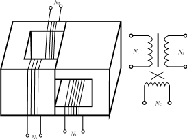 從20世紀80年代末開始,對由垂直形鐵心構(gòu)成的立體布置的多功能鐵心結(jié)構(gòu)進行研究的人員越來越多。最早是有人把C形鐵心的一半轉(zhuǎn)90°而形成的,發(fā)現(xiàn)在沒轉(zhuǎn)90°的C形鐵心上的繞組之間仍存在變壓器功能,轉(zhuǎn)90°的C形鐵心上繞上一個繞組,可以通過電流激磁后,改變沒轉(zhuǎn)90°的C形鐵心上繞組的電感〔見圖11(a)〕。后來把鐵心去掉一些變成圖11(b),仍然具有這樣的功能。圖11(c)是把兩個變壓器和兩個可控電感組合在一起的多功能鐵心結(jié)構(gòu)。
