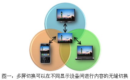 目前我國的三網(wǎng)融合進程正在加速。三網(wǎng)融合帶給用戶最大的體驗就是多屏幕的融合,同樣的服務(wù)可以由不同的終端設(shè)備實現(xiàn),而不同的設(shè)備也可以訪問相同的資源。在三網(wǎng)融合的大背景下,多屏切換的概念也應(yīng)運而生。多屏切換在多屏幕融合基礎(chǔ)上,向用戶提供了多個顯示終端的跨屏交互服務(wù),用戶的使用內(nèi)容可以在不同顯示終端的屏幕上進行無縫連接。舉例來說,對于同樣的一段視頻,用戶在戶外可以用手機觀看一部分,在辦公場所可以用PC接續(xù)觀看,而回到家中則可以繼續(xù)用電視觀看剩余的部分。對于其他的應(yīng)用,如游戲、音樂等,多屏切換也允許進行類似的操作。從數(shù)字電視的角度來看,多屏切換對數(shù)字電視有極大的推動作用。數(shù)字電視做為最傳統(tǒng)也是顯示面積最具優(yōu)勢的設(shè)備,可以提供不同于手機和PC的體驗。