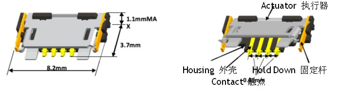 該連接器為0.2毫米(錯位排列)連接間距,帶有0.4毫米導(dǎo)向位。目前可提供11針和29針,計劃最多達81針。連接器高度為0.9+/-毫米。其外殼材料為熱塑塑料(UL 94V-0), 固定調(diào)整片和連接器的銅合金無鹵素。作為底部接觸型產(chǎn)品,因此可最為廣泛地適用于掀蓋式執(zhí)行器,很方便進行關(guān)門操作。就連接器規(guī)格而言,連接器可通過帶有外殼開槽結(jié)構(gòu)的耳式電纜分割結(jié)構(gòu)提供電纜預(yù)持功能。要求的電纜厚度是:0.2毫米+/-0.03