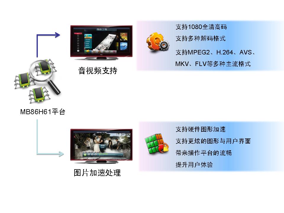 MB86H61系列芯片基于多核CPU架構(gòu),內(nèi)部集成了富士通獨有專利技術(shù)的硬件視頻處理器視頻解碼單元解碼全高清/標(biāo)清MPEG-2、H.264、VC-1、AVS、FLV、MKV等多種視頻格式,而音頻解碼單元則采用高性能的ARC725TM(594DMIPS)支持DD、DD+、AAC、DRA等多種先進(jìn)音頻格式。因此,該芯片的ARM11內(nèi)核主CPU將全部用于處理應(yīng)用程序,其性能將有足夠的裕量,能充分保證系統(tǒng)運(yùn)行的平穩(wěn)流暢。“獨立的硬件圖形加速功能還使其能更輕松地支持豐富的圖形用戶界面、高清圖片顯示,從而大大提升用戶體驗。”富士通半導(dǎo)體業(yè)務(wù)發(fā)展總監(jiān)黃自力表示,“該芯片對于全高清AVS視頻解碼的支持尤其值得一提,目前市場上大部分的高清芯片所能支持的AVS解碼還停留在標(biāo)清階段。”