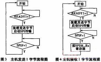 (2)軟件部分:單片機(jī)為主控制器,首先查詢從機(jī)狀態(tài)標(biāo)志位READY是否為1,判斷是否可以與從機(jī)通信。從機(jī)準(zhǔn)備就緒時,單片機(jī)可裝載1字節(jié)發(fā)送數(shù)據(jù),啟動CPLD內(nèi)部SPI接口電路,查詢并等待SPI傳輸結(jié)束標(biāo)志位SPIF為1,完成一字節(jié)數(shù)據(jù)傳輸,如此重復(fù)。圖3、圖4為主機(jī)發(fā)送與接收1字節(jié)流程圖。