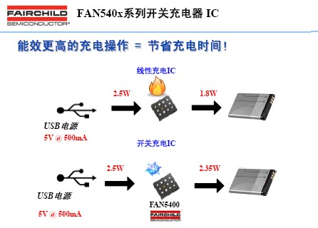 FAN5400系列電池充電器IC使用高集成度開關(guān)模式充電器,以便最大限度地縮短從USB電源為單節(jié)鋰離子(Li-Ion)電池充電的時間,并使用升壓調(diào)節(jié)器從電池為USB外設(shè)供電。由于充電電流和電池容量繼續(xù)增加,使用線性充電器通過USB端口或5V AC/DC適配器進(jìn)行充電的效率變得越來越低,F(xiàn)AN5400的開關(guān)模式充電器能夠提供高達(dá)94%的效率,有助于加快充電速度并減少熱耗散。