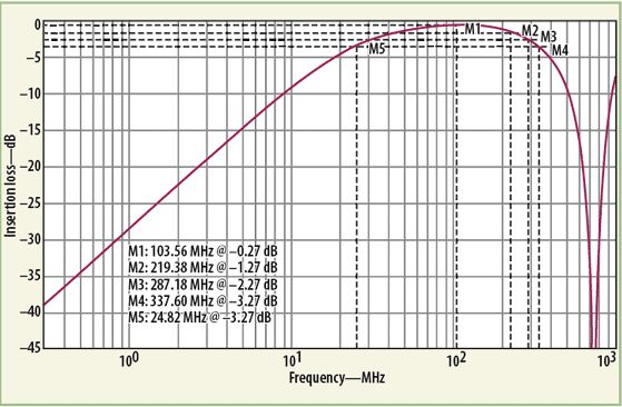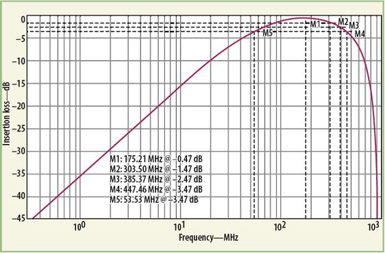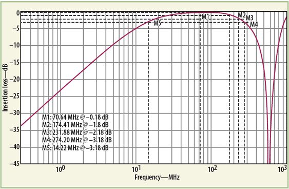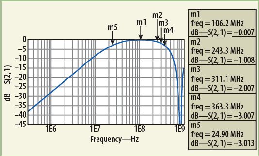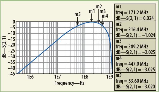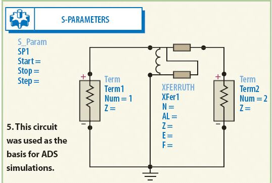MathWorks的MATLAB數(shù)學(xué)分析軟件曾被用來分析這種變壓器器件模型的響應(yīng)。分析中,把單獨(dú)的低頻(公式1)響應(yīng)和高頻(公式5)響應(yīng)的插損響應(yīng)結(jié)合在了一起。將所需的目標(biāo)值代入MATLAB公式,可獲得寬帶變壓器的最終響應(yīng)。為了執(zhí)行MATLAB模型數(shù)值響應(yīng)的電氣仿真,使用了ADS建模軟件。該軟件有一個(gè)很有用的內(nèi)部源模型,稱為XFERRUTH,其變量參數(shù)包括匝數(shù)(N)、電感因子(AL)、傳輸線特性阻抗(Z)、傳輸線電氣長度(E),以及計(jì)算傳輸線長度所需要的參考頻率(F)。