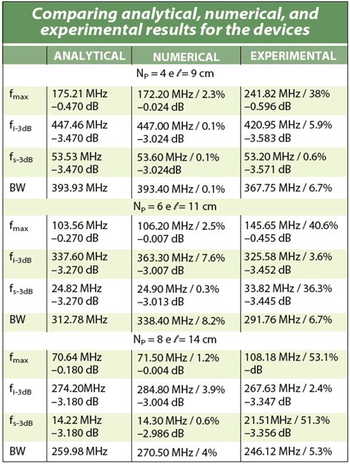 構(gòu)建的第一個(gè)器件線圈匝數(shù)為4,因此傳輸線長度為9cm。圖8、9和10分別顯示了分析、數(shù)值和實(shí)驗(yàn)三種情況下的頻率插損行為。表中總結(jié)了主要的參數(shù)值,包括最大幅值、-3dB頻率(fmax、fi-3dB和fs-3dB)、適當(dāng)?shù)膸挘˙W),以及相比模型值頻率偏差百分比下的各種插損結(jié)果。通過分析、數(shù)值和實(shí)驗(yàn)方法獲得的結(jié)果間的偏差非常小,信號頻率最大時(shí)例外。這都是由于測量設(shè)置中噪聲和其它寄生效應(yīng)造成的測試系統(tǒng)的局限性。在幅度基本穩(wěn)定的測試頻帶上,信號電平的變化是幾乎察覺不到的,也許這就是最大信號幅度頻率的報(bào)告中出現(xiàn)偏差的原因。