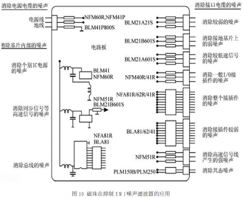 圖8、圖9、圖10 分別示出了磁珠在直流供電回路、數(shù)字電話、抑制 EMI 噪聲濾波器中的應(yīng)用實(shí)例。