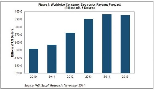 但不都是負面消息。雖然第二和第三季度的消費電子營業(yè)收入低于去年同期水平,但隨著電視與藍光播放器假日銷售高于2010年水平,上述趨勢將從第四季度開始逆轉。IHS公司認為,預計2012和2013年增長率將超過4%,相比于當前的低迷狀態(tài),屆時多數(shù)消費電子領域將會恢復活力。