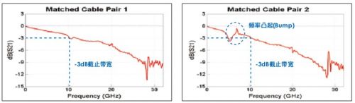 圖1,匹配電纜對(duì)的頻率響應(yīng),額定帶寬為18GHz。-3dB截止帶寬實(shí)際上大約為10GHz,低于額定帶寬。除此之外,兩條電纜的特性不相似,可能在部分信號(hào)內(nèi)容過(guò)度衰減或放大時(shí)導(dǎo)致波形失真。特別是在第二條匹配電纜對(duì)上,可以在5GHz~8GHz之間看到頻率響應(yīng)凸起