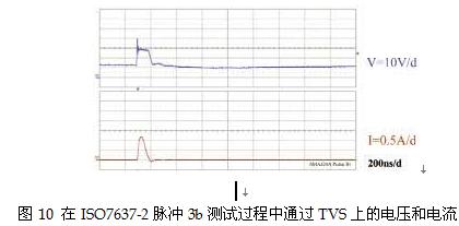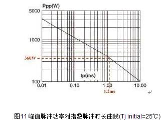 以SMAJ24A為例,從產(chǎn)品數(shù)據(jù)表摘取這些參數(shù)與圖11的曲線進行比較,發(fā)現(xiàn)SMAJ24A符合ISO7637-2脈沖2測試的要求,可承受長達1.2ms的360 W指數(shù)脈沖,這個數(shù)值遠遠高于ISO7637-2脈沖2電涌強制的4μs時長。