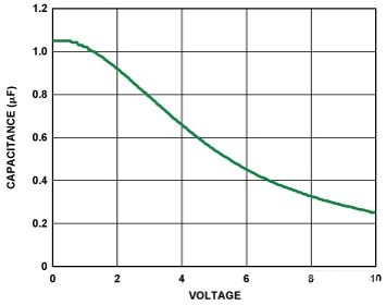 圖4所示為采用0402封裝的1 μF、10 V X5R電容與偏置電壓之間的關(guān)系。電容的封裝尺寸和電壓額定值對(duì)其電壓穩(wěn)定性影響極大。一般而言,封裝尺寸越大或電壓額定值越高,電壓穩(wěn)定性也就越好。X5R電介質(zhì)的溫度變化率在-40℃至+85°C溫度范圍內(nèi)為±15%,與封裝或電壓額定值沒(méi)有函數(shù)關(guān)系。