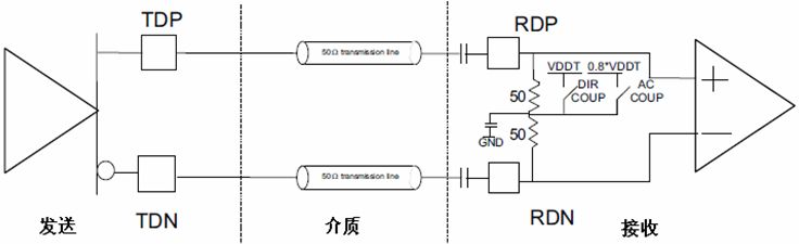 圖3是TLK3132高速串行接口的AC耦合框圖,采用CML高速電平接口,發(fā)送側內部集成了50歐姆的匹配電阻。接收端支持DC和AC耦合,若采用直流耦合時,共模電壓由發(fā)送側決定,匹配電阻直接上拉到VDDT,若采用交流耦合,為得到最優(yōu)的共模偏置電壓,選擇芯片內部0.8VDDT的偏置電壓。在實際電路設計中,推薦采用交流耦合方式,容易實現(xiàn)不同接口的電平轉換,并可去除共模噪聲,避免外界噪聲對接收端的影響。