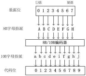 在串行鏈路通信中,為了實現(xiàn)信號時鐘的恢復,需要避免出現(xiàn)長串0和長串1,同時保持電路上正負電平平衡,能正確地交流耦合避免信號失真,需要傳輸信號中的0和1數(shù)量數(shù)目相等,因此業(yè)界廣泛應用8B/10B編解碼方法:實現(xiàn)8B到10B的映射(圖4),即一個字節(jié)(8bits)用10bits來表示,從中挑選出連續(xù)0或者1個數(shù)不會超過3個,0和1的個數(shù)差不大于2 (最多6個’0’或’1’)。