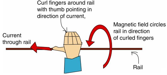 根據(jù)Maxwell方程式,移動(dòng)走線中的電荷可以產(chǎn)生一電流,此電流又會(huì)產(chǎn)生一磁場(chǎng),這種被移動(dòng)電荷產(chǎn)生的磁場(chǎng)稱作「磁通線(magnetic lines of flux)」。使用「右手法則(Right-Hand Rule)」可以輕易地指出磁通線的方向,如附圖四所示。右手拇指代表走線電流流動(dòng)的方向,其余卷曲的手指包圍著走線,代表磁場(chǎng)或磁通線的方向。此外,時(shí)變磁場(chǎng)會(huì)產(chǎn)生一個(gè)垂直的電場(chǎng)。射頻輻射是此磁場(chǎng)和電場(chǎng)的組合。藉由輻射或?qū)щ姷姆绞剑艌?chǎng)和電場(chǎng)會(huì)離開PCB結(jié)構(gòu)。