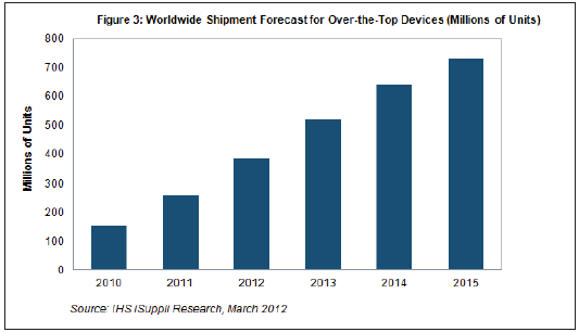 據(jù)IHS iSuppli公司的消費平臺專題報告,到2015年,支持OTT的產品出貨量預計將從2011年的2.58億個增長到7.31億個。今年支持OTT的產品出貨量預計將達到3.848億個,比2011年增長近50%,如下圖所示。2011年這個OTT市場強勁增長68%。