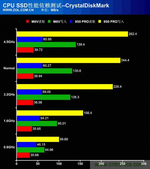 接下來的CrystalDiskMark測試,SSD的性能表現(xiàn)基本和AS SSD Benchmark相似,隨著CPU的頻率提升,SSD的4KB讀取和寫入都得到了顯著的提升。