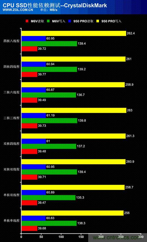 接下來的CrystalDiskMark測試,SSD的性能表現(xiàn)同樣和AS SSD Benchmark相似,CPU核心數(shù)量和線程數(shù)量的增加并未對SSD的讀寫性能造成影響。