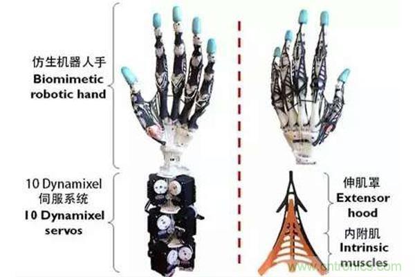 關(guān)節(jié)韌帶(身體用來(lái)固定關(guān)節(jié)且控制它們活動(dòng)范圍的部分)的材料使用了高強(qiáng)度的Spectra帶,并帶有激光切割的橡膠板來(lái)代替增加關(guān)節(jié)依從性的軟組織。伸肌和屈肌的肌腱(用來(lái)矯直和彎曲手指的部分)也由Spectra帶構(gòu)成,同時(shí)用更多的激光切割橡膠板代替了腱鞘和伸肌腱帽,后者是通過(guò)包裹手指來(lái)使其應(yīng)對(duì)靈活性和扭矩的復(fù)雜的蹼狀多層結(jié)構(gòu)。UW(華盛頓大學(xué)縮寫)手的最后一部分構(gòu)成是肌肉,它是由一排10個(gè)Dynamixel伺服系統(tǒng)組成,它們的電纜布線也緊密的模仿了人手的腕隧道。