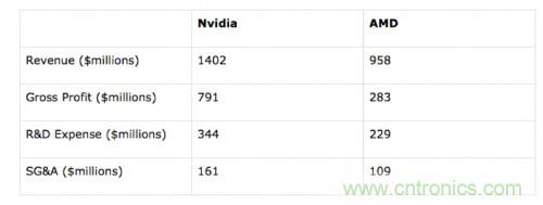 另一個(gè)重要的優(yōu)勢(shì)是,Nvidia公司的財(cái)務(wù)實(shí)力在恢復(fù)。目前Nvidia是盈利的,并有望在研發(fā)中比AMD投入更多的的資金,而此前則不得不削減營(yíng)運(yùn)費(fèi)用。下面的表格提供了兩家公司最新一個(gè)季度的財(cái)務(wù)狀況比較: