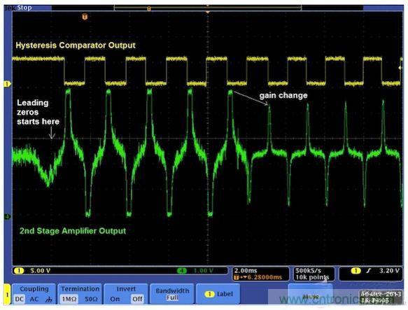 CPU讀取ADC,然后控制放大器增益。放大后的信號(hào)送到磁滯比較器產(chǎn)生邊沿接近信號(hào)峰值的數(shù)字信號(hào)。CPU隨后必須調(diào)整放大器增益,使其閾值接近峰值但不超過(guò)峰值。這有助于避免磁卡發(fā)生抖動(dòng)時(shí)出現(xiàn)定時(shí)誤差。磁滯比較器輸出則送到定時(shí)器進(jìn)行脈沖寬度測(cè)量。CPU讀取定時(shí)器輸出,并解碼為邏輯1或0的數(shù)據(jù)。當(dāng)劃卡結(jié)束時(shí),CPU打包數(shù)據(jù)比特,檢查是否有錯(cuò)誤,然后通過(guò)I2C、SPI或UART接口將數(shù)據(jù)送給主機(jī)。
