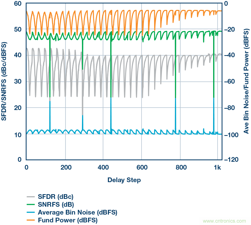 為了獲得最佳延遲設置,將一個信號施加于THA和ADC組合,該信號應在ADC帶寬范圍之外。本例中,我們選擇一個約10 GHz的信號,并施加-6 dBFS的電平(在FFT顯示屏上捕獲)。延遲設置現(xiàn)在以二 進制步進方式掃描,信號的電平和頻率保持恒定。在掃描過程中顯示并捕獲FFT,收集每個延遲設置對應的基波功率和無雜散動態(tài)范圍 (SFDR) 數值。