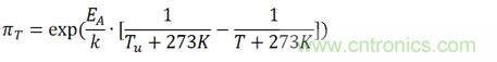 公式中,αf為測試的加速因子,也就是加速(后綴為a)測試條件下MTTF(Mean Time To Failures,平均無故障時間)與參考(后綴為u)測試條件下MTTF之比。EA是活化能,在0.79eV和0.95eV之間,k為玻爾茲曼常數(shù)。指數(shù)x為相對濕度的影響,指數(shù)y為電壓的影響,都是經(jīng)驗數(shù)據(jù),但是必須通過實際評估來確認。我們把此加速模型擴展到壽命預估模型中。