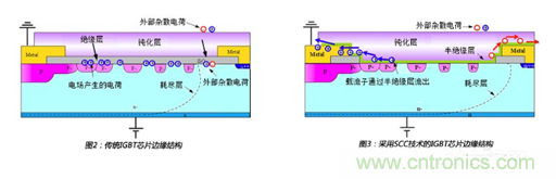 為了抑制IGBT芯片邊緣電荷集聚,SCC技術采用了優(yōu)化的半絕緣性材料替代傳統(tǒng)的絕緣材料,這個半絕緣性層為集聚的載流子提供了通路,如圖3所示,在高濕工況下,產(chǎn)生的載流子會通過半絕緣層傳遞出去,避免了電荷的大量集聚。