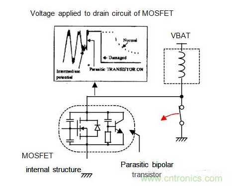 當MOSFET處于關(guān)閉狀態(tài)時,開關(guān)的開啟會導致MOSFET的破壞:由于機械開關(guān)的短暫時間,高的dvdt會激活在MOSFET中包含的寄生晶體管。浪涌的能量將集中在這種寄生晶體管上;這可以破壞寄生雙極晶體管,并破壞MOSFET本身。MOSFET在漏極源和源極之間的絕對短路損壞。