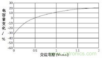 由于I類(lèi)MLCC以順電材料組成,它的電容不會(huì)因交流電壓轉(zhuǎn)變而變化,但I(xiàn)I類(lèi)MLCC電容是隨著交流電壓的增加而變化。在II類(lèi)MLCC中,Y5V顯示交流電壓的變化比X5R/X7R更嚴(yán)重,這是由于鐵電材料的電壓對(duì)極化曲線的非線性特性。