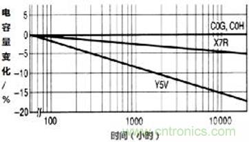 II類(lèi)MLCC的電容量隨室溫中長(zhǎng)時(shí)間放置呈對(duì)數(shù)關(guān)系減少,但I(xiàn)類(lèi)MLCC由順電性質(zhì)的材料組成而不會(huì)有老化現(xiàn)象。老化本質(zhì)上是可逆的,但元件的老化是不能阻止的。在MLCC的試驗(yàn)性能前,我們需要進(jìn)行熱處理。即通過(guò)在居里點(diǎn)以上加熱(150℃至少1小時(shí))并冷卻至室溫,將MLCC晶體結(jié)構(gòu)恢復(fù)到其最佳的無(wú)序排列,從而實(shí)現(xiàn)最大電容量。