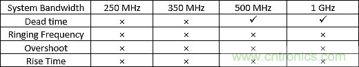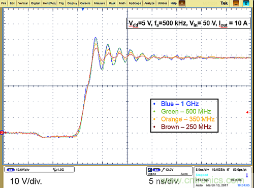 采用EPC8009的設(shè)計所測量到的振鈴頻率(fr1)為1.176GHz,它采用最高帶寬1GHz的探頭。圖2(頂部)中顯示的較低帶寬情況進一步降低了測量振鈴頻率的準確性。當考慮峰值電壓過沖時,同樣很明顯的是,較低帶寬測量值會低估各個開關(guān)器件的峰值電壓。對于與時序相關(guān)的死區(qū)時間的測量,系統(tǒng)帶寬也很重要。如圖2(頂部)所示,對于500MHz和1GHz帶寬,死區(qū)時間是可見的,雖然測量來并不是很精確。在較低帶寬下,死區(qū)時間幾乎不存在。表1顯示了采用最高速的EPC8009,系統(tǒng)帶寬對關(guān)鍵測量結(jié)果的影響。
