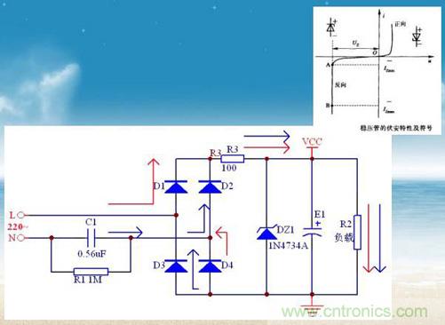 采用半波整流方式,根據(jù)計算式I1=0.5|I|=34500C可知,C=0.43uF。所以此處選用0.47uF的電容,反過來可以驗(yàn)證提供的電流I1=34500C=16.2mA,多余電流從穩(wěn)壓管流過。
