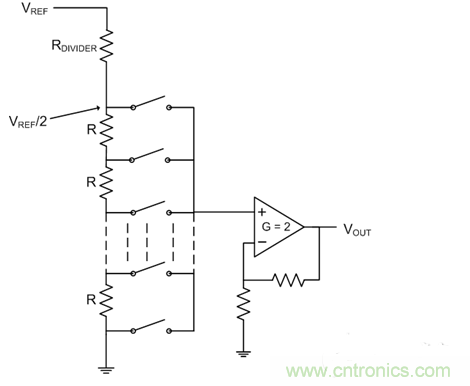 電阻串 DAC 設計最終、最微妙的元件是位于串電阻器及接點之前的分壓器。該電阻器電阻等于串中其余電阻器的等效阻抗,能有效將參考輸入減半。這樣做的目的是降低輸出緩沖器的共模輸入要求,并在實現(xiàn)良好性能的同時幫助保持低成本。為了對此進行補償,輸出緩沖器一般采取 2 倍的非反相增益,盡管有時反饋電阻器通過數(shù)字控制實現(xiàn)不同增益。
