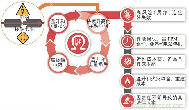 電站的盈利能力與選擇高質(zhì)量的部件息息相關(guān)。業(yè)主在光伏連接器上節(jié)省資金,并不是一種明智的做法。因為,不注重質(zhì)量,通常意味著后續(xù)的高損失和風險,而這些本可避免。光伏連接器的低接觸電阻及長期可靠性,能夠保障電站高效和安全運行。而持續(xù)升高的接觸電阻會導致光伏項目的安全風險大幅提高,降低電站運行效率。需要指出的是,各種不同的風險因素是密切相關(guān)的,如圖1 所示。