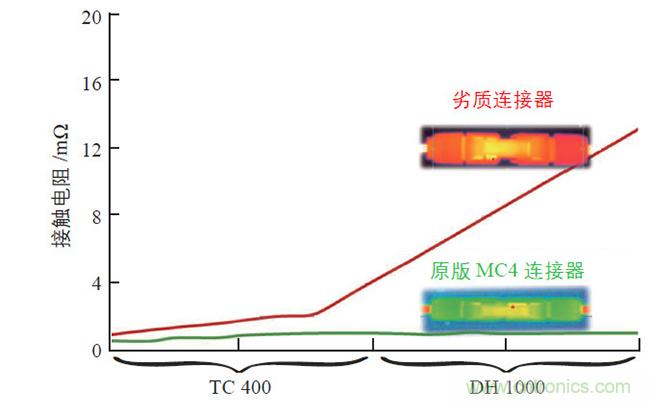 從光伏連接器的外觀和質(zhì)感可大致了解該產(chǎn)品的外形設(shè)計及絕緣材料的選擇。但是,評價光伏連接器好壞的核心指標是公母連接器對插之后的接觸電阻。一個高質(zhì)量的連接器須具有很低的接觸電阻,并能夠長期維持這種低接觸電阻狀態(tài)。根據(jù)光伏連接器最新國際標準IEC 62852,公母對插后的接觸電阻在TC200+DH1000 測試后,增量不能大于5 mΩ或者電阻終值小于初始值的150%。而這僅是最低要求,不同廠商連接器的接觸電阻值取決于制造商的技術(shù)水平。對于如何評判接觸電阻,TC400(2×TC200)和DH1000 實驗提供了一個解讀方向。圖2 為實驗比較后的結(jié)果,由圖2 可知,高質(zhì)量的光伏連接器的接觸電阻非常穩(wěn)定,這主要得益于其所使用的電連接技術(shù)。因此,客戶在選擇光伏連接器時,須對其所使用的核心技術(shù)進行全面的了解。