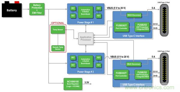 安森美半導(dǎo)體的FUSB302B是完全符合AEC-Q100車規(guī)的可編程的USB Type-C控制器,含電源傳輸,集成了一個(gè)BMC客戶端配置通道,支持全Type-C PD 2.0 的1.1版本。這意味著CC可用于檢測設(shè)備何時(shí)連接或未連接、主機(jī)或設(shè)備的當(dāng)前功能,以及是否存在有源電纜,以及選擇所需的模式(如音頻適配器或調(diào)試附件模式)。圖1顯示了一個(gè)典型應(yīng)用的框圖。